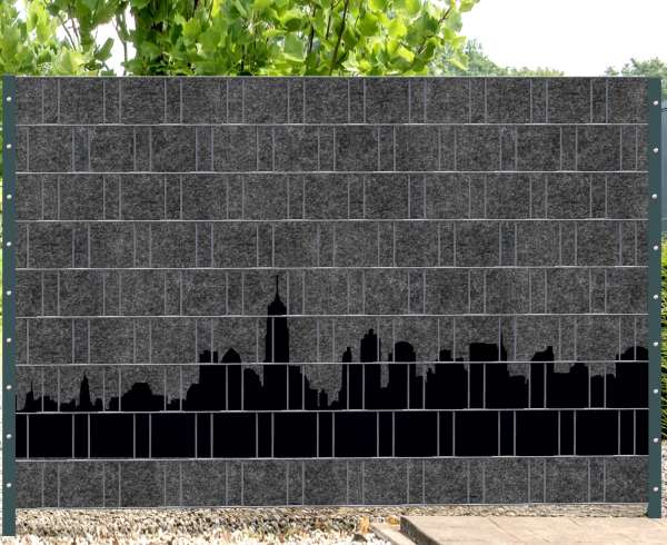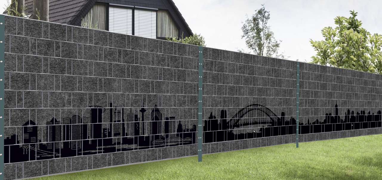 Die edle Melange-Oberfläche mit schwarzem Motivdruck sorgt für einen stilvollen und urbanen Look – ideal für moderne Garten- und Grundstückszäune.