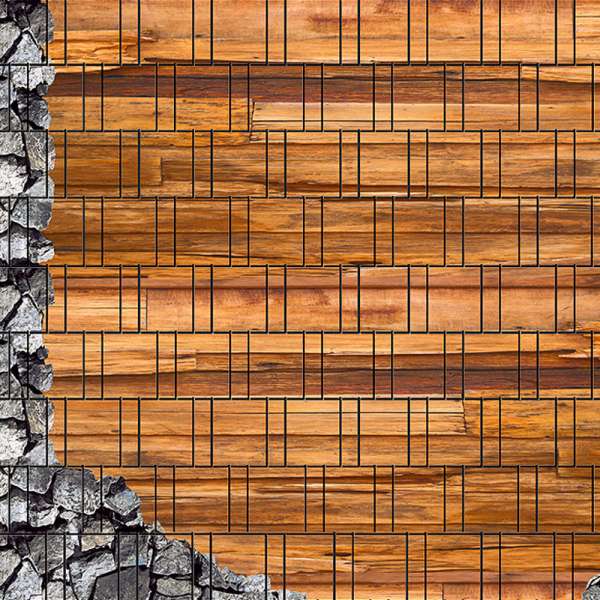 Die Kombination aus rustikaler Holzstruktur und detailreichem Steinmuster schafft eine warme, authentische Atmosphäre – ideal für moderne und klassische Gartenkonzepte gleichermaßen.