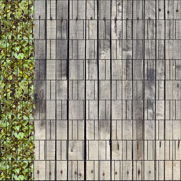 Verleihen Sie Ihrem Garten ein natürliches und stilvolles Erscheinungsbild mit dem Sichtschutzmotiv „Holzwand & Kirschlorbeer“.