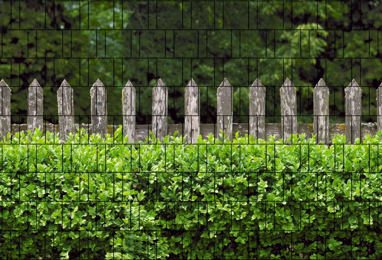 Holzzaun & Buxus – Bedruckter Sichtschutz für Doppelstabmattenzaun | Natürliches Holz- & Buchsbaumdesign | 2,5 m × 1,8 m | UV-beständig & wetterfest