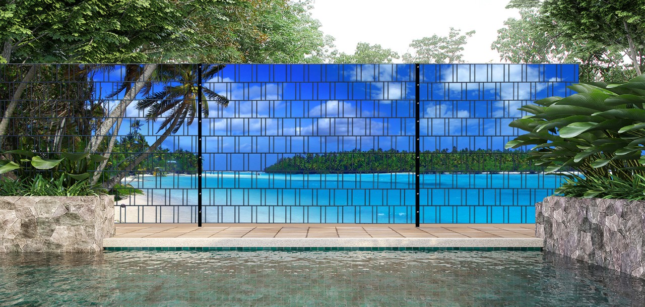 Diese bedruckten XXL-Zaunverkleidungen verwandeln Ihren Stabmatten- oder Doppelstabmattenzaun in eine tropische Lagunenlandschaft – für ein exklusives Urlaubsgefühl zu Hause.