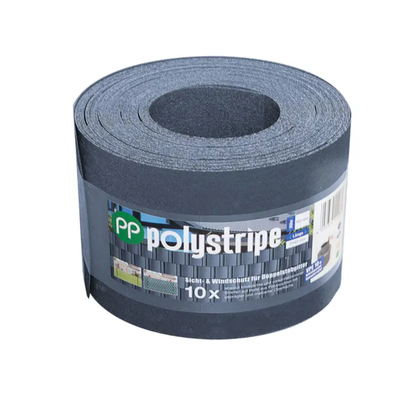Blickdichte, UV-stabile Polystripe Sicht- und Windschutzstreifen aus Polypropylen (PP) in der Farbe Anthrazitgrau mit geprägter, mattierter Oberfläche. Passgenau für Doppelstabmatten 200 mm, langlebig, witterungsbeständig und wahlweise als Einzelstreifen oder auf Spenderrolle erhältlich.