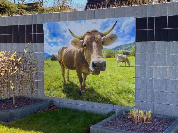 Zaunposter & Gartenposter „Kuh“ – wetterfestes Outdoor-Poster aus Polyester | UV-beständig, PVC-frei & rostfreie Ösen | ca. 300 g/m²